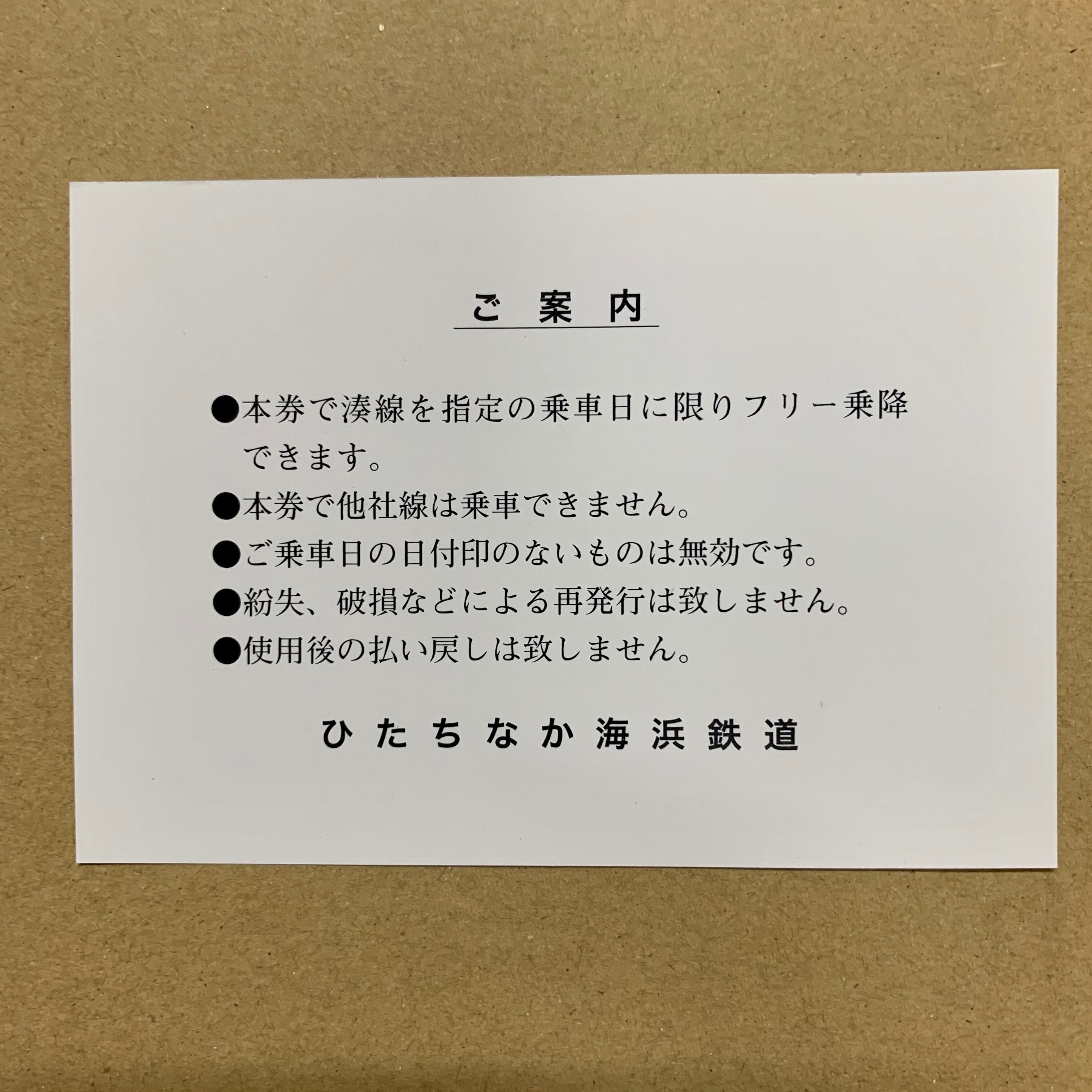 発行日から1年内で希望日の1日に限り湊線を乗り降りすることができる乗車券です。