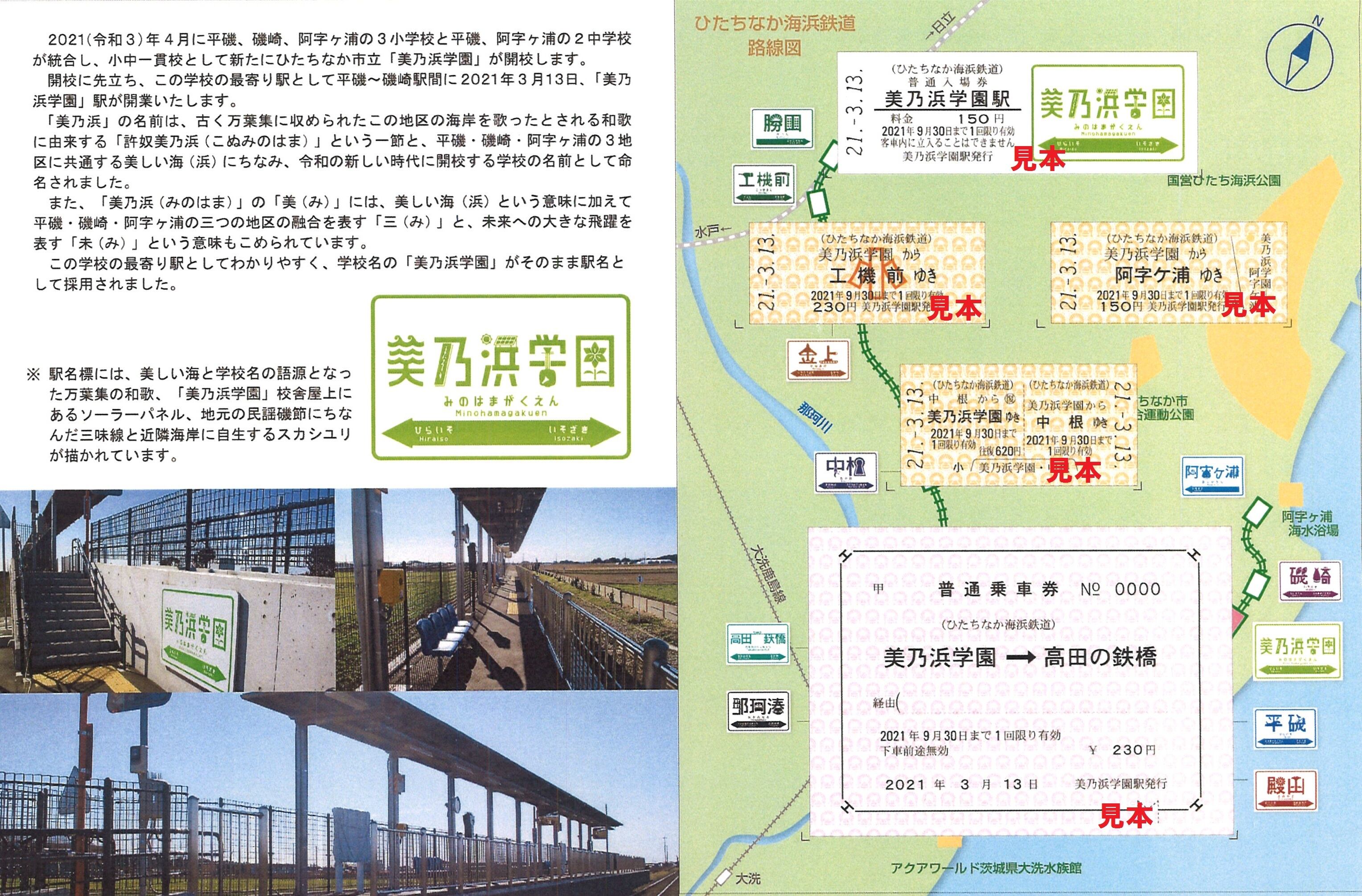 令和3年3月13日開業予定の湊線の新駅「美乃浜学園駅」の記念乗車券セットです。